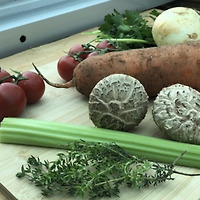 3) 차가운물에 모든재료 (당근, 양파, 마늘, 샐러리, 방울토마토, 파슬리, 타임, 소고기, 사골)을 넣고 끓인다.