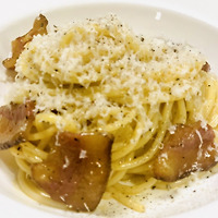수분의 양이 이정도 일때 만떼까레를 시작해 주면 됩니다. 가스불을 끄고 수분과 전분, 오일, 면이 부딪히면서 유화(소스처럼 섞이는, 물과 오일이 섞이는) 됩니다. 소스가 차가운 공기를 만나 더 크리미해지며, 면에 달라붙게 됩니다.